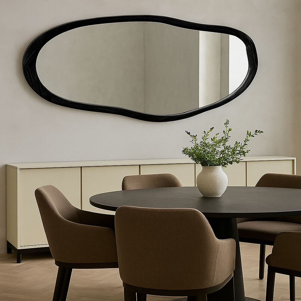 Crafted from solid American Oak with a Matt-Black finish. Organic shaped mirrors bring a sense of calm.. with harmonious pebble like flow they make for a practical and unique focal point for your space, softening your room instantly. A practical and timeless piece you'll appreciate every time you walk past it.